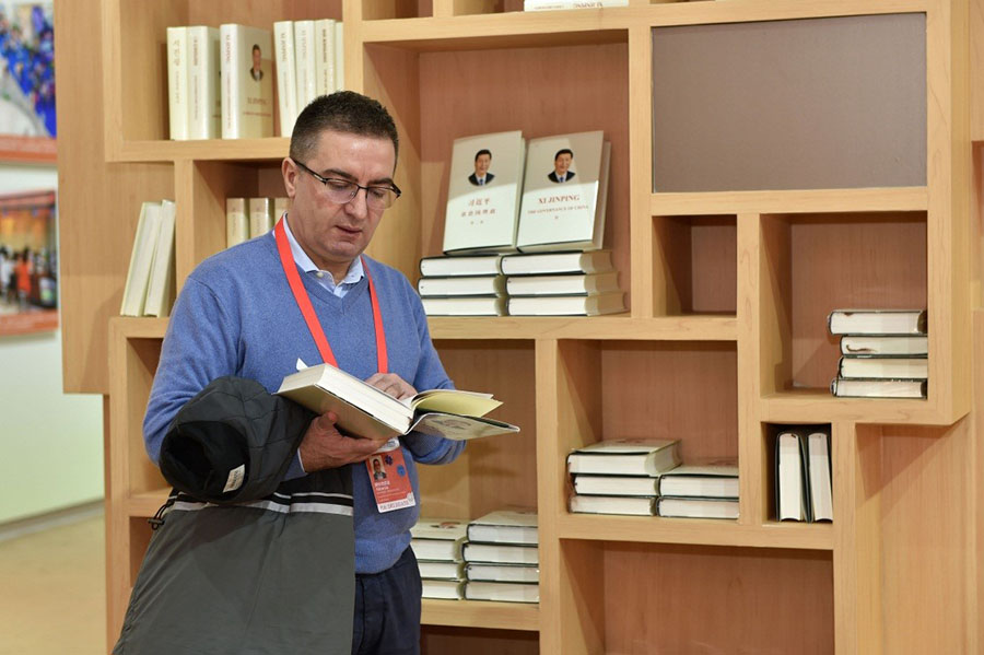En la ma?ana del primero de diciembre del 2017, una grupo de líderes de partidos políticos extranjeros, participantes en el “Diálogo de alto nivel entre el Partido Comunista Chino (PCCh) y los partidos políticos mundiales”, celebrado en Beijing, visitaron la exposición “Cinco a?os de grandes esfuerzos”. En la foto, un participante lee ?Xi Jinping: la gobernanza de China?. (Foto: Pueblo en Línea/Wen Qiyu)