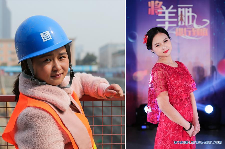 SHAANXI, marzo 7, 2018 (Xinhua) -- Imagen combinada del 6 de marzo de 2018 del retrato de la trabajadora de la construcción Li Xiaoling portando su uniforme en un sitio de construcción en Xi'an, provincia de Shaanxi, en el noroeste de China (i), y presentando un vestido durante un desfile de moda llevado a cabo para celebrar el próximo Día Internacional de la Mujer, en Xi'an, provincia de Shaanxi, en el noroeste de China (d). (Xinhua/Str)