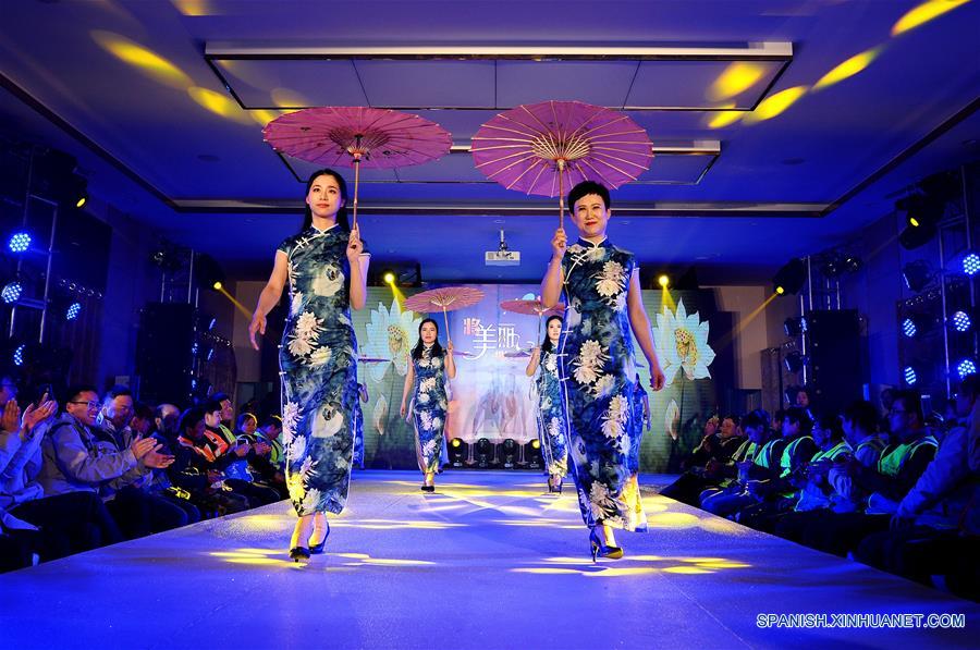 SHAANXI, marzo 7, 2018 (Xinhua) -- Imagen del 6 de marzo de 2018 de trabajadoras de la construccion presentando vestidos durante un desfile de moda llevado a cabo para celebrar el próximo Día Internacional de la Mujer, en un sitio de construcción en Xi'an, provincia de Shaanxi, en el noroeste de China. (Xinhua/Liu Xiao)