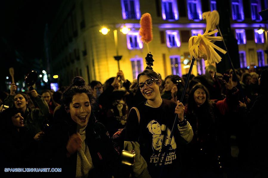 MADRID, marzo 8, 2018 (Xinhua) -- Mujeres golpean ollas y sartenes mientras gritan consignas durante la cacerolada (protesta de golpeo de ollas) llevada a cabo en el marco del Día Internacional de la Mujer en la Plaza del Sol en Madrid, capital de Espa?a, el 8 de marzo de 2018. Espa?a celebra el jueves la primer huelga general feminista de su historia en un Día Internacional de la Mujer marcado por un informe de la Fundación de Estudios de Economía Aplicada (Fedea) que se?ala que las mujeres cobran un 13 por ciento menos por hora que los hombres por hacer trabajos similares. La huelga convocada para el jueves no limita sus peticiones a la igualdad de salarios, sino que también es una protesta frente a la violencia machista (48 mujeres asesinadas por sus parejas en 2017 y 916 desde que se empezaron a medir estos datos, en 2003). (Xinhua/Juan Carlos Lucas/NurPhoto/ZUMAPRESS)