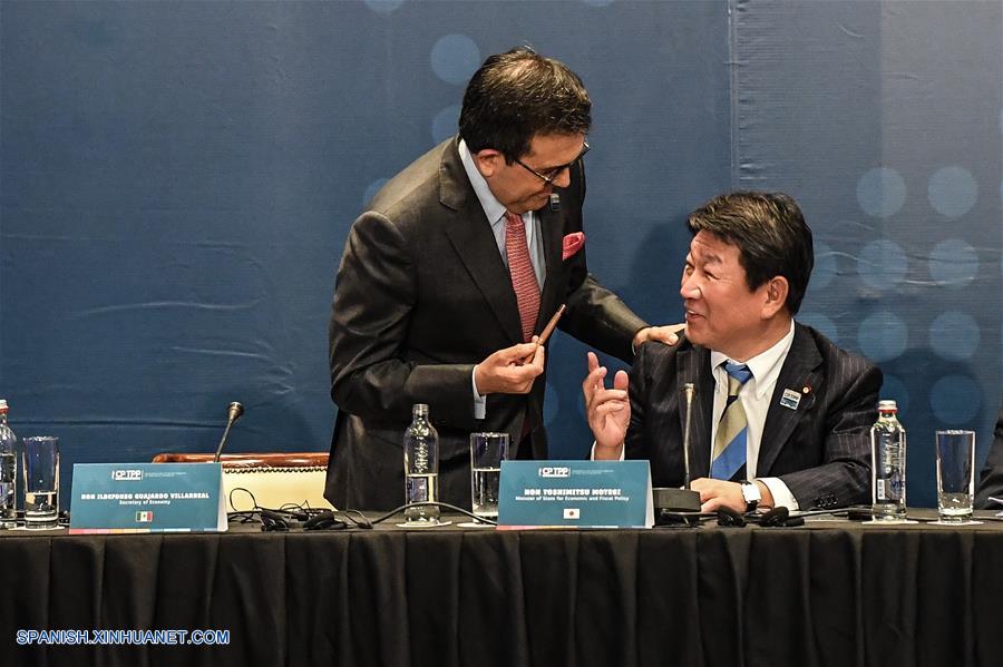 SANTIAGO, marzo 8, 2018 (Xinhua) -- El secretario de Economía de México, Ildefenso Guajardo (i), conversa con el ministro de Estado para la Política Económica y Fiscal de Japón, Toshimitsu Motegi (d) durante la ceremonia de Firma del Tratado Integral y Progresista de Asociación Transpacífico (CPTPP, por sus siglas en inglés), en Santiago, capital de Chile, el 8 de marzo de 2018. El Tratado Integral y Progresista de Asociación Transpacífica (CPTPP) fue firmado el jueves en Santiago de Chile, por Canadá, Nueva Zelanda, Chile, Australia, Brunei, Malasia, México, Japón, Perú, Singapur y Vietnam. El CPTPP es uno de los acuerdos más importantes del mundo y los países que lo integran suman el 18 por ciento de la economía global. (Xinhua/Jorge Villegas)