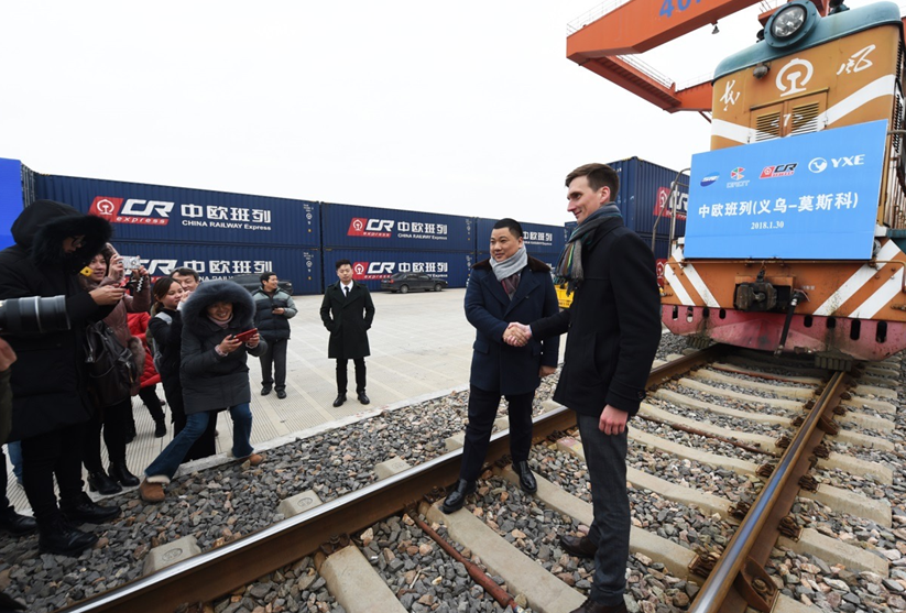 El 30 de enero de 2018, el tren China-Europa con 100 contenedores sale de la estación de ferrocarril del oeste de Yiwu. Pasando de atravesar las fronteras de Manchuria, el tren se dirige hacia Moscú, Rusia. La imagen muestra a los operadores chinos y rusos recibiendo entrevistas de los periodistas. (Foto: Gong Xianming / Pueblo en Línea)