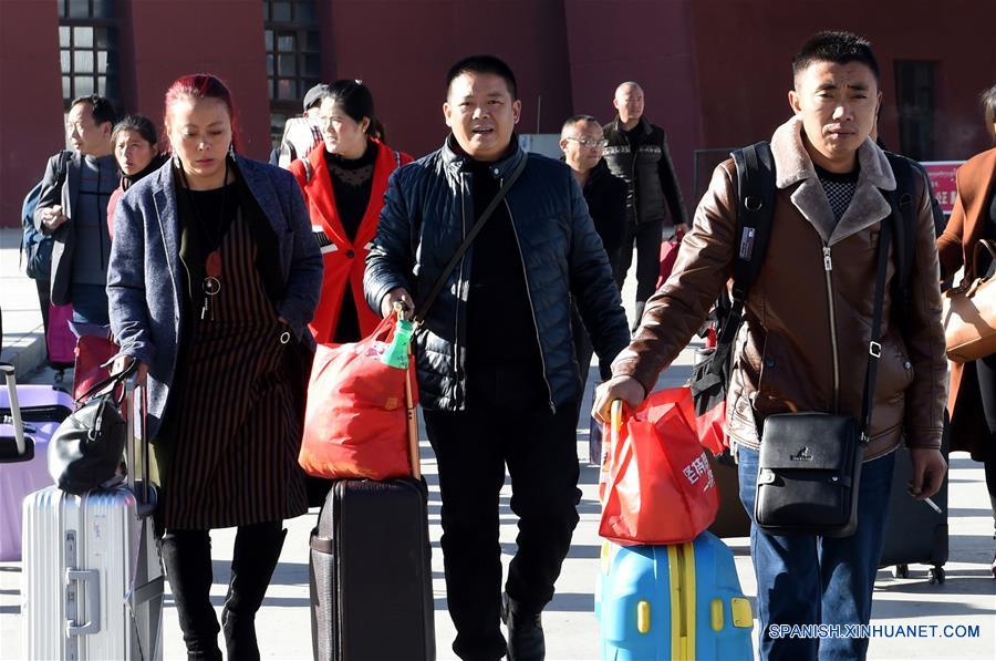 LHASA, marzo 12, 2018 (Xinhua) -- Pasajeros llegan a la Estación de Ferrocarriles de Lhasa, en Lhasa, en la Región Autónoma del Tibet, en el suroeste de China, el 12 de marzo de 2018. Este periodo, también conocido como "Chunyun", usualmente ve un incremento en el flujo de pasajeros por los 40 días por el Festival de Primavera. (Xinhua/Chogo)