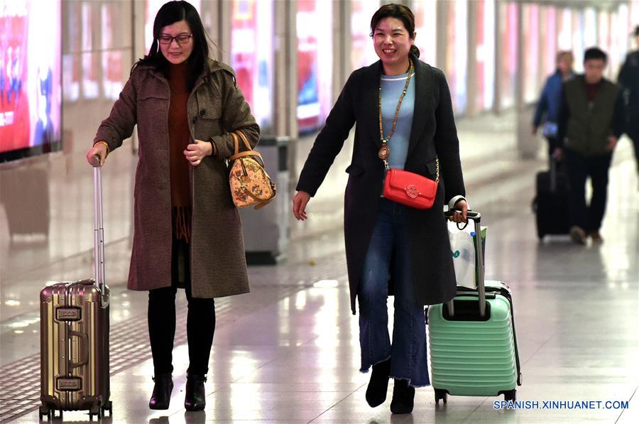 HENAN, marzo 12, 2018 (Xinhua) -- Dos pasajeras dejan la Estación de Ferrocarriles de Zhengzhou, en Zhengzhou, en la provincia de Henan, en el centro de China, el 12 de marzo de 2018. Este periodo, también conocido como "Chunyun", usualmente ve un incremento en el flujo de pasajeros por los 40 días por el Festival de Primavera. (Xinhua/Li Jia'nan)