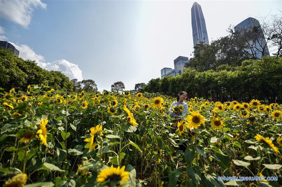 Una mujer posa en un parque de girasoles cerca del Centro Cívico Shenzhen, en Shenzhen, en la provincia de Guangdong, en el sur de China, el 12 de marzo de 2018. (Xinhua/Mao Siqian)
