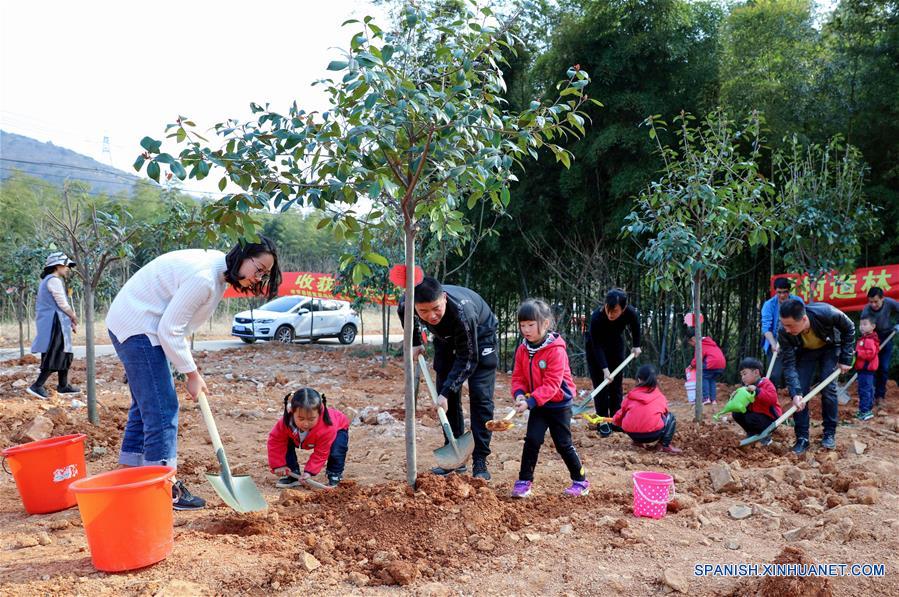 Ni?os excavan el suelo bajo la guía de sus padres y maestros durante una actividad de plantación de árboles, en la aldea de Lijiaxiang, en el condado de Changxing, en la provincia de Zhejiang, en el este de China, el 12 de marzo de 2018. Una actividad de plantación de árboles dirigida a fomentar la conciencia de los ni?os sobre la protección del medio ambiente fue llevada a cabo el lunes en la aldea de Lijiaxiang. (Xinhua/Xu Xu)