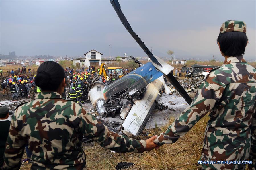 Elementos de seguridad vigilan cerca del sitio donde un avión se estrelló al aterrizar, en Katmandú, Nepal, el 12 de marzo de 2018. Al menos 49 personas murieron y otras 17 resultaron heridas al estrellarse el lunes un avión de pasajeros de la US-Bangla Airlines en el Aeropuerto Internacional de Tribhuvan (TIA) de Nepal, confirmaron las autoridades. El avión Bombardier Dash Q-400, con 67 pasajeros y cuatro miembros de la tripulación a bordo, se estrelló durante el aterrizaje. El vuelo UBG211 estaba en camino a Katmandú desde la ciudad de Dhaka, en Bangladesh. (Xinhua/Sunil Sharma)