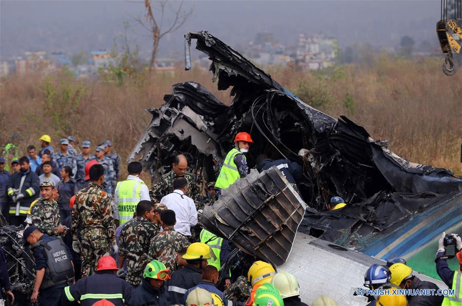 Rescatistas trabajan en el sitio donde un avión se estrelló al aterrizar, en Katmandú, Nepal, el 12 de marzo de 2018. Al menos 49 personas murieron y otras 17 resultaron heridas al estrellarse el lunes un avión de pasajeros de la US-Bangla Airlines en el Aeropuerto Internacional de Tribhuvan (TIA) de Nepal, confirmaron las autoridades. El avión Bombardier Dash Q-400, con 67 pasajeros y cuatro miembros de la tripulación a bordo, se estrelló durante el aterrizaje. El vuelo UBG211 estaba en camino a Katmandú desde la ciudad de Dhaka, en Bangladesh. (Xinhua/Sunil Sharma)