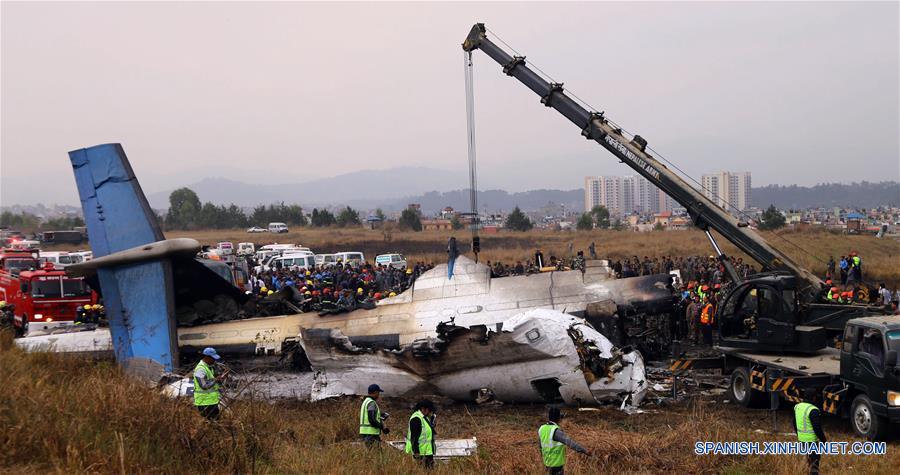 Rescatistas trabajan en el sitio donde un avión se estrelló al aterrizar, en Katmandú, Nepal, el 12 de marzo de 2018. Al menos 49 personas murieron y otras 17 resultaron heridas al estrellarse el lunes un avión de pasajeros de la US-Bangla Airlines en el Aeropuerto Internacional de Tribhuvan (TIA) de Nepal, confirmaron las autoridades. El avión Bombardier Dash Q-400, con 67 pasajeros y cuatro miembros de la tripulación a bordo, se estrelló durante el aterrizaje. El vuelo UBG211 estaba en camino a Katmandú desde la ciudad de Dhaka, en Bangladesh. (Xinhua/Sunil Sharma)