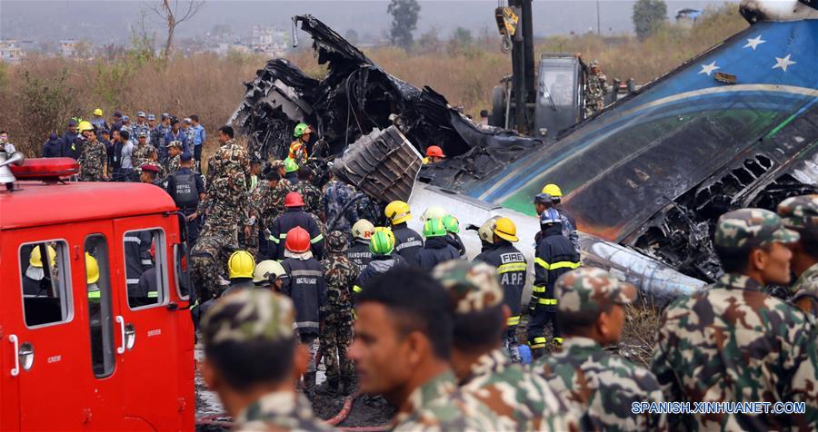 Rescatistas trabajan en el sitio donde un avión se estrelló al aterrizar, en Katmandú, Nepal, el 12 de marzo de 2018. Al menos 49 personas murieron y otras 17 resultaron heridas al estrellarse el lunes un avión de pasajeros de la US-Bangla Airlines en el Aeropuerto Internacional de Tribhuvan (TIA) de Nepal, confirmaron las autoridades. El avión Bombardier Dash Q-400, con 67 pasajeros y cuatro miembros de la tripulación a bordo, se estrelló durante el aterrizaje. El vuelo UBG211 estaba en camino a Katmandú desde la ciudad de Dhaka, en Bangladesh. (Xinhua/Sunil Sharma)
