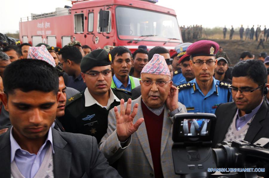 El primer ministro de Nepal, K.P Sharma Oli (c) conversa con representantes de medios de comunicación cerca del sitio donde un avión se estrelló al aterrizar, en Katmandú, Nepal, el 12 de marzo de 2018. Al menos 49 personas murieron y otras 17 resultaron heridas al estrellarse el lunes un avión de pasajeros de la US-Bangla Airlines en el Aeropuerto Internacional de Tribhuvan (TIA) de Nepal, confirmaron las autoridades. El avión Bombardier Dash Q-400, con 67 pasajeros y cuatro miembros de la tripulación a bordo, se estrelló durante el aterrizaje. El vuelo UBG211 estaba en camino a Katmandú desde la ciudad de Dhaka, en Bangladesh. (Xinhua/Sunil Sharma)