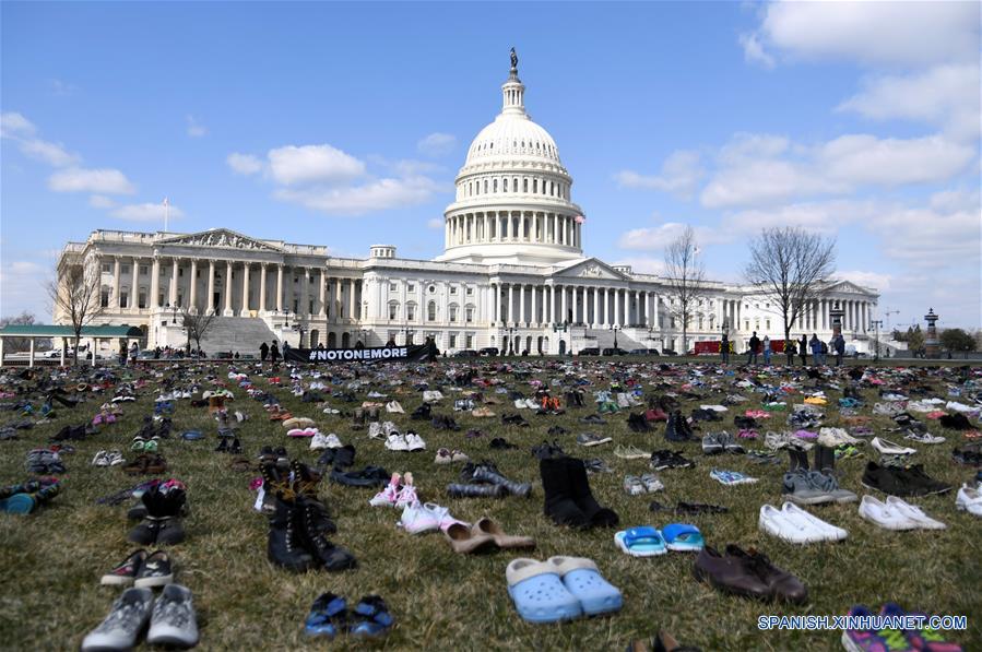 WASHINGTON, D.C., marzo 13, 2018 (Xinhua) -- Zapatos que representan a ni?os asesinados en tiroteos en escuelas desde el tiroteo en la Escuela Primaria Sandy Hook en 2012, permanecen en el césped frente al Capitolio, en Washington, D.C., Estados Unidos, el 13 de marzo de 2018. De acuerdo con información de la prensa local, un grupo de activistas colocó el martes 7,000 pares de zapatos en el césped frente al Congreso estadounidense, en protesta contra la inacción de los legisladores ante los frecuentes tiroteos en las escuelas en el país. (Xinhua/Yang Chenglin)