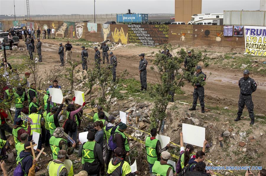 TIJUANA, marzo 13, 2018 (Xinhua) -- Elementos de seguridad vigilan cerca del sitio de una manifestación en contra de la propuesta del presidente estadounidense, Donald Trump, de la construcción del muro fronterizo entre México y Estados Unidos, en Tijuana, Baja California, México, el 13 de marzo de 2018. El presidente de Estados Unidos, Donald Trump, inspeccionó el martes prototipos del muro fronterizo que prometió construir durante su campa?a presidencial de 2016. "Si no tenemos un muro aquí, no tendremos un país", dijo Trump al recorrer ocho prototipos del muro que prometió construir para mantener fuera a los inmigrantes indocumentados cerca de San Diego, California. (Xinhua/Str)