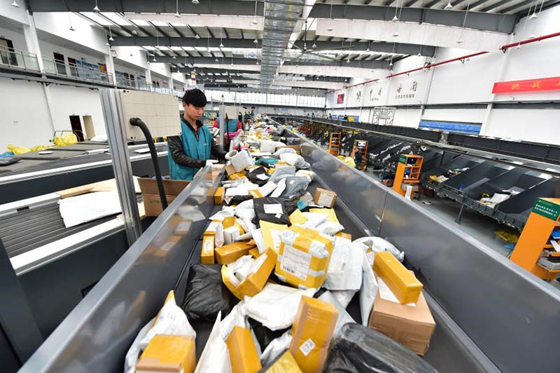 El 7 de marzo de 2018, imagen del Departamento de Intercambio de Mensajería Internacional de Yiwu en Zhejiang. Ese día llegó un lote de paquetes de mensajería que EMS enviará a Estados Unidos. El número total de correos entrantes y salientes en este departamento superó los 100 millones, de los que 99,8 millones eran correos internacionales. (Fuente de la foto: Lu Bin / Renmin Shijue)