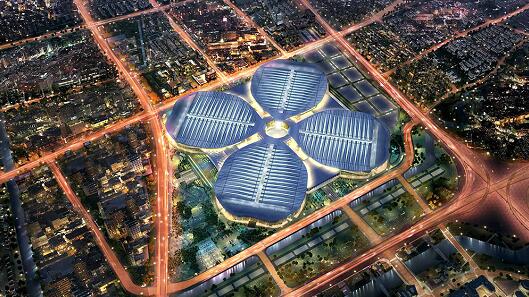 El Centro Nacional de Convenciones y Exposiciones tiene un área construida total de 1,47 millones de metros cuadrados, con 400.000 metros cuadrados de salas de exposiciones cubiertas y 100.000 metros cuadrados de salas de exposiciones al aire libre, 150.000 metros cuadrados de zona comercial, 180.000 metros cuadrados de oficinas y un hotel de 5 estrellas de 60.000 metros cuadrados. Fuente de la foto: Centro Nacional de Convenciones y Exposiciones (Shanghai)