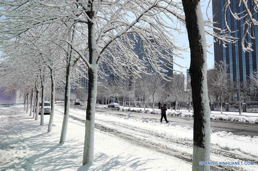 Un peatón camina a través de una calle cubierta de nieve, en Shenyang, provincia de Liaoning, en el noreste de China, el 15 de marzo de 2018. (Xinhua/Long Lei)