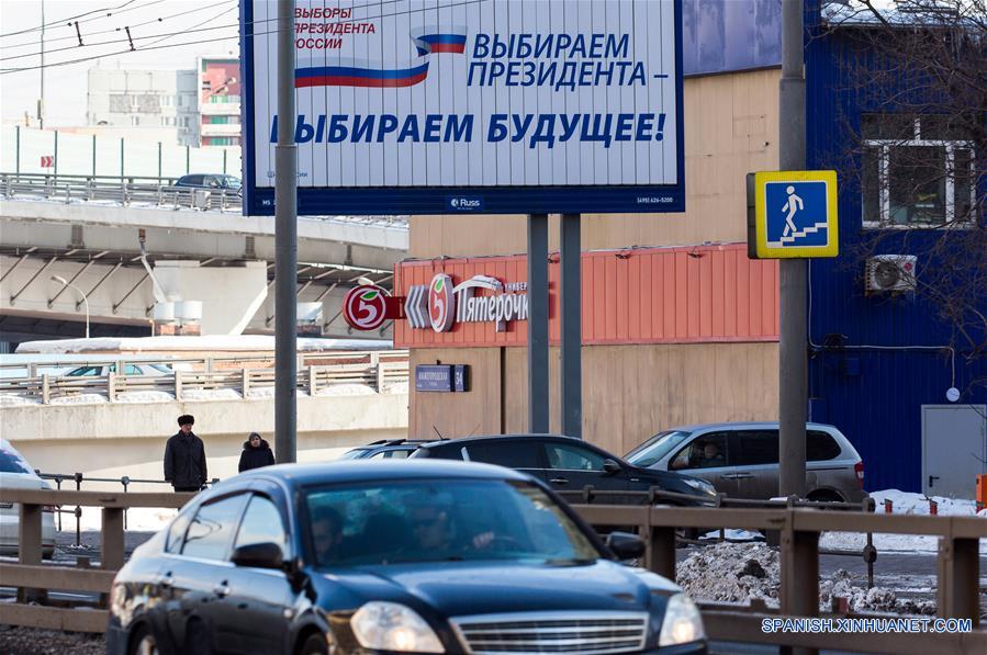 Un tablero publicitario acerca de la elección presidencial rusa es captado en Moscú, capital de Rusia, el 17 de marzo de 2018. La elección presidencial rusa será llevada a cabo el 18 de marzo de 2018. (Xinhua/Bai Xueqi)