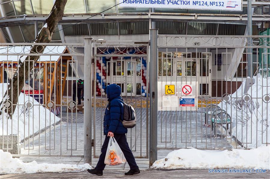 Una residente camina frente a un centro electoral, en Moscú, capital de Rusia, el 17 de marzo de 2018. La elección presidencial rusa será llevada a cabo el 18 de marzo de 2018. (Xinhua/Bai Xueqi)