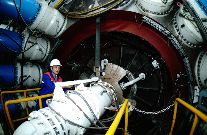 El 30 de agosto de 2017, un trabajador de la sección trece del túnel de Wangjing en el la construcción del tren de alta velocidad Beijing-Shenyang inspeccionaba los rodamientos principales de la tuneladora. (Fuente: Pueblo en Línea)