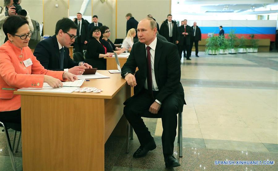 MOSCU, marzo 18, 2018 (Xinhua) -- El presidente ruso, Vladimir Putin (d-frente), se registra para emitir su voto durante las elecciones presidenciales, en Moscú, capital de Rusia, el 18 de marzo de 2018. Cerca de 110 millones de ciudadanos rusos emitirán su voto en unas 97,000 casillas instaladas en todo el país para elegir al presidente para los próximos seis a?os. El presidente Vladimir Putin busca un cuarto período y enfrenta a siete rivales, incluyendo Pavel Grudinin del Partido Comunista y a Vladimir Zhirinovsky, líder del Partido Democrático Liberal. (Xinhua/Kremlin Pool/Planet Pix/ZUMAPRESS)