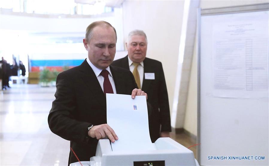 MOSCU, marzo 18, 2018 (Xinhua) -- El presidente ruso, Vladimir Putin (c-frente), deposita su voto durante las elecciones presidenciales, en Moscú, capital de Rusia, el 18 de marzo de 2018. Cerca de 110 millones de ciudadanos rusos emitirán su voto en unas 97,000 casillas instaladas en todo el país para elegir al presidente para los próximos seis a?os. El presidente Vladimir Putin busca un cuarto período y enfrenta a siete rivales, incluyendo Pavel Grudinin del Partido Comunista y a Vladimir Zhirinovsky, líder del Partido Democrático Liberal. (Xinhua/Kremlin Pool/Planet Pix/ZUMAPRESS)