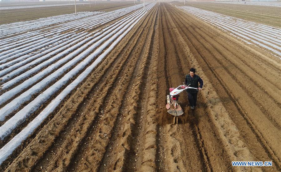 Los agricultores trabajan en un campo de patatas en Tangshan, provincia de Hebei, al norte de China, el 18 de marzo de 2018. (Xinhua / Dong Jun)