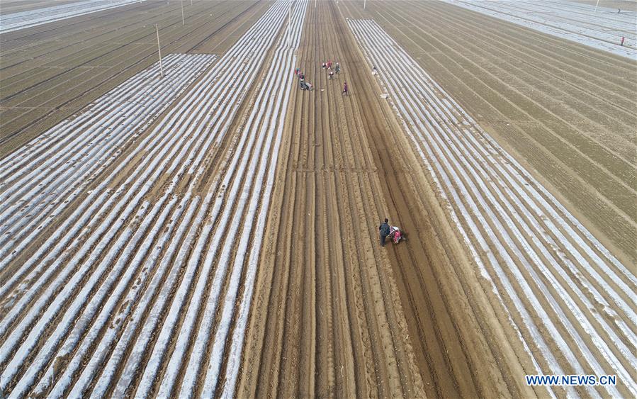 Los agricultores trabajan en un campo de patatas en Tangshan, provincia de Hebei, al norte de China, el 18 de marzo de 2018. (Xinhua / Dong Jun)