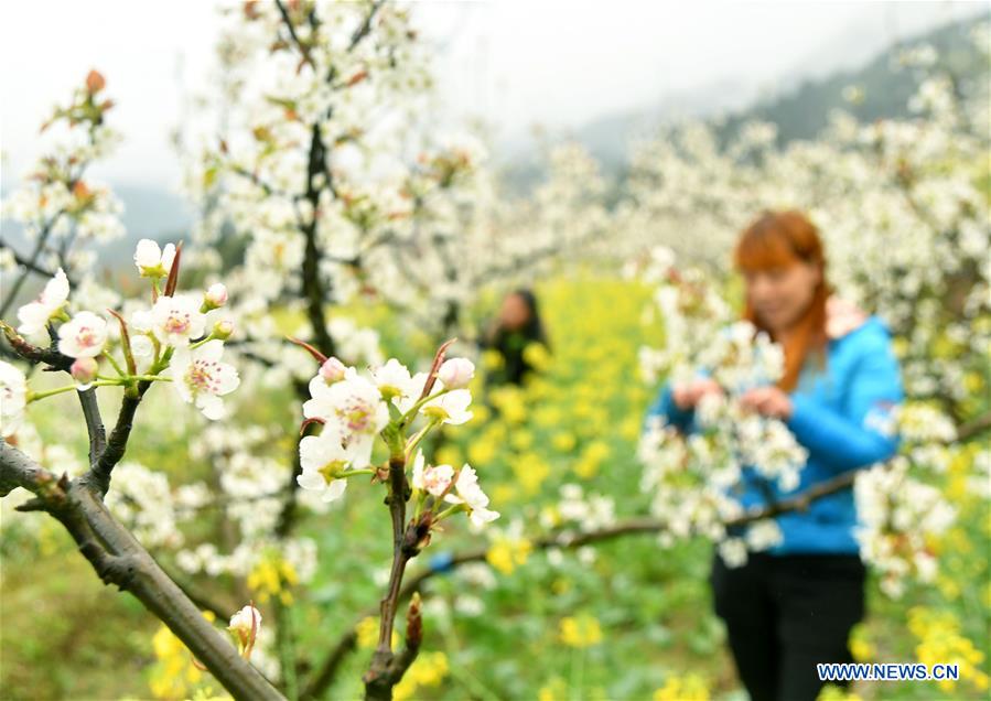 Hunan, 21/03/2018 (El Pueblo en Línea) - Los agricultores trabajan en un campo de perales en Shaoyang, provincia central de Hunan, el 19 de marzo de 2018. (Xinhua / Yan Qinlong)