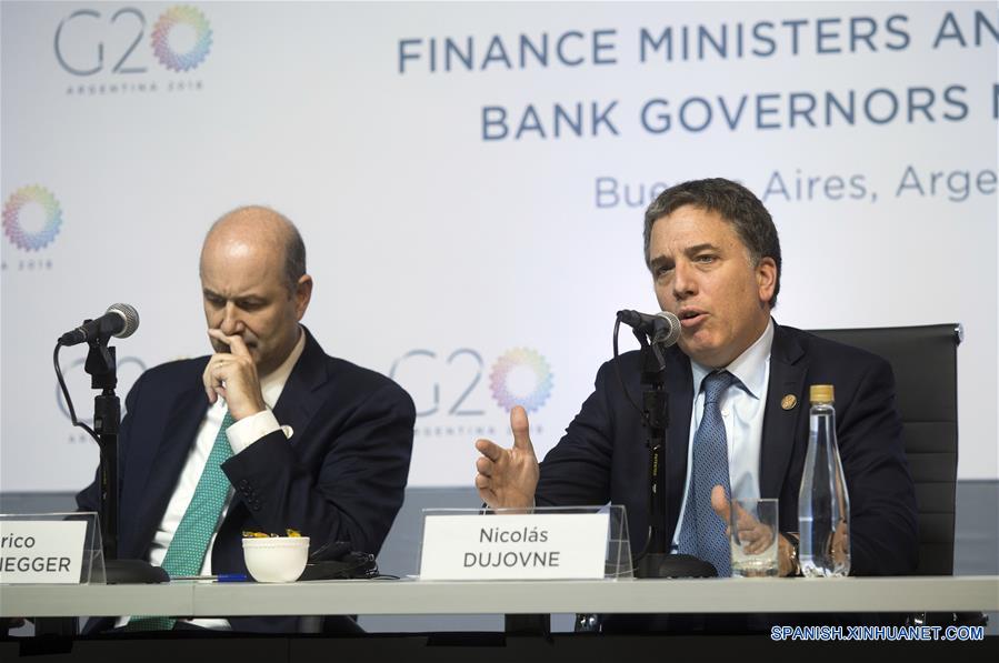 El ministro de Finanzas de Argentina, Nicolás Dujovne (d), participa junto al presidente del Banco Central, Federico Sturzenegger (i), durante una conferencia de prensa ofrecida en el marco de la primera reunión de ministros de Finanzas y presidentes de Bancos Centrales del Grupo de los 20 (G20), en el Centro de Exposiciones y Convenciones (CEC) en la ciudad de Buenos Aires, capital de Argentina, el 20 de marzo de 2018. El ministro de Finanzas de Argentina, Nicolás Dujovne, admitió el martes que "no van a ser fáciles" de conseguir consensos en las deliberaciones del Grupo de los 20 (G20), al cerrar la primera de las dos jornadas de la reunión de ministros de Finanzas y gobernadores de Bancos Centrales del mecanismo que acoge esta capital. Bajo la presidencia de Argentina, 22 ministros de Finanzas, 17 presidentes de Bancos Centrales y 10 titulares de organizaciones internacionales, entre ellos la directora gerente del Fondo Monetario Internacional (FMI), Christine Lagarde, sesionan en esta ciudad para considerar temas como el financiamiento de la infraestructura, el futuro del trabajo y la tecnología detrás de las criptomonedas, en el Centro de Exposiciones y Convenciones (CEC) del barrio de Recoleta. (Xinhua/Martín Zabala)