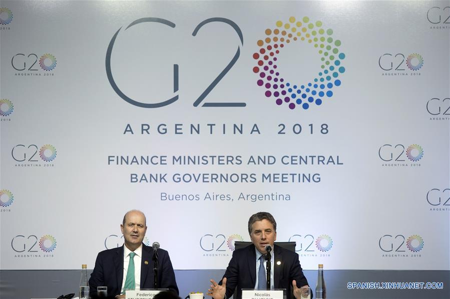 El ministro de Finanzas de Argentina, Nicolás Dujovne (d), participa junto al presidente del Banco Central, Federico Sturzenegger (i), durante una conferencia de prensa ofrecida en el marco de la primera reunión de ministros de Finanzas y presidentes de Bancos Centrales del Grupo de los 20 (G20), en el Centro de Exposiciones y Convenciones (CEC) en la ciudad de Buenos Aires, capital de Argentina, el 20 de marzo de 2018. El ministro de Finanzas de Argentina, Nicolás Dujovne, admitió el martes que "no van a ser fáciles" de conseguir consensos en las deliberaciones del Grupo de los 20 (G20), al cerrar la primera de las dos jornadas de la reunión de ministros de Finanzas y gobernadores de Bancos Centrales del mecanismo que acoge esta capital. Bajo la presidencia de Argentina, 22 ministros de Finanzas, 17 presidentes de Bancos Centrales y 10 titulares de organizaciones internacionales, entre ellos la directora gerente del Fondo Monetario Internacional (FMI), Christine Lagarde, sesionan en esta ciudad para considerar temas como el financiamiento de la infraestructura, el futuro del trabajo y la tecnología detrás de las criptomonedas, en el Centro de Exposiciones y Convenciones (CEC) del barrio de Recoleta. (Xinhua/Martín Zabala)