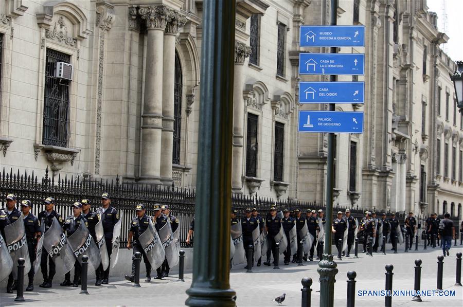 Oficiales de la policía nacional, montan guardia frente al Palacio de Gobierno, en el Patio de Honor del Palacio de Gobierno, en la ciudad de Lima, Perú, el 21 de marzo de 2018. Pedro Kuczynski anunció el miércoles su renuncia como presidente de Perú, en medio de una crisis política y ofreció "una transcición constitucionalmente ordenada". (Xinhua/Luis Camacho)