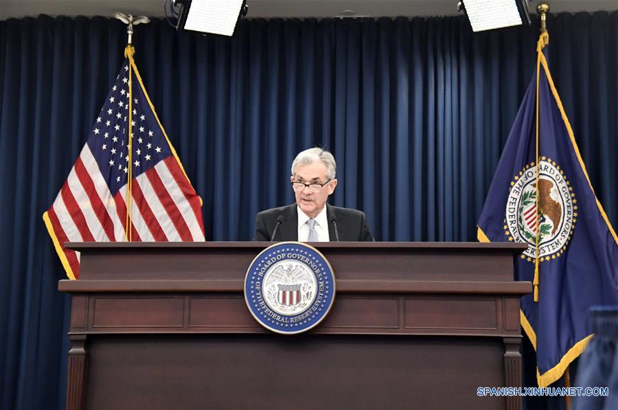 El presidente de la Reserva Federal estadounidense, Jerome Powell, participa durante una conferencia de prensa, en Washington, D.C., Estados Unidos, el 21 de marzo de 2018. La Reserva Federal (Fed) de Estados Unidos elevó el miércoles la tasa de interés de referencia en 25 puntos base, el primer aumento en 2018. En vista de las condiciones esperadas del mercado laboral y de la inflación, la Fed decidió elevar el rango objetivo de la tasa sobre fondos federales a entre 1,5 y 1,75 por ciento, dijo el banco central en una declaración al término de una reunión de dos días. (Xinhua/Yang Chenglin)