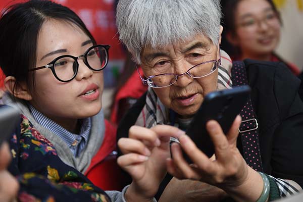Un voluntario ense?a a una anciana cómo utilizar un teléfono inteligenteen Taiyuan, provincia de Shanxi.[Foto: Wu Junjie/China News Service]