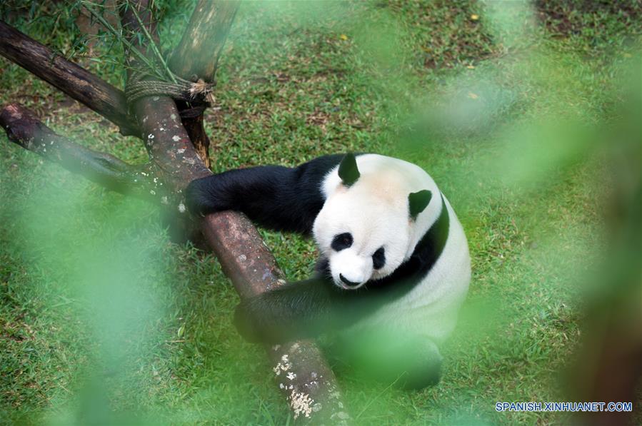 BOGOR, marzo 24, 2018 (Xinhua) -- El panda gigante Caitao se sujeta a la rama de un arbol en el Zoológico Safari Taman de Indonesia, en Bogor, Indonesia, el 24 de marzo de 2018. El par de pandas gigantes Caitao y Huchun se ha convertido en uno de los iconos del parque de animales indonesio y ha llamado la atención de los indonesios desde su llegada en septiembre pasado. (Xinhua/Du Yu)