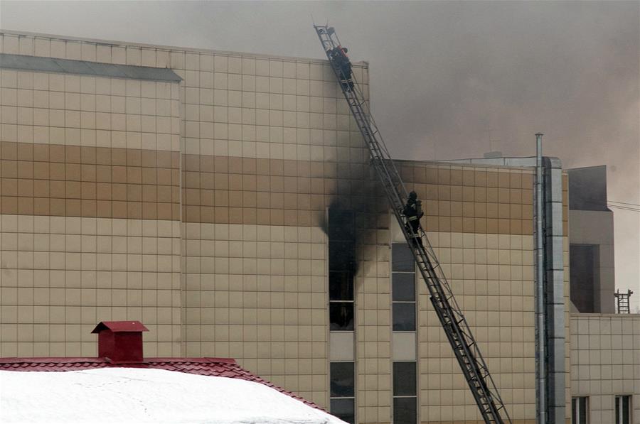 Miembros del servicio de bomberos del ministerio de emergencia intenta sofocar un incendio en el centro comercial Zimnyaya Vishnya en Kemerovo, Rusia, el 25 de marzo de 2018. Al menos 37 personas murieron en un incendio ocurrido el domingo en un centro comercial de la ciudad rusa de Kemerovo, informó la agencia TASS. Informes anteriores mencionaron 69 desaparecidos, incluyendo 40 ni?os. Los bomberos buscan a los desaparecidos en el lugar de los hechos. (Xinhua/Sputnik)