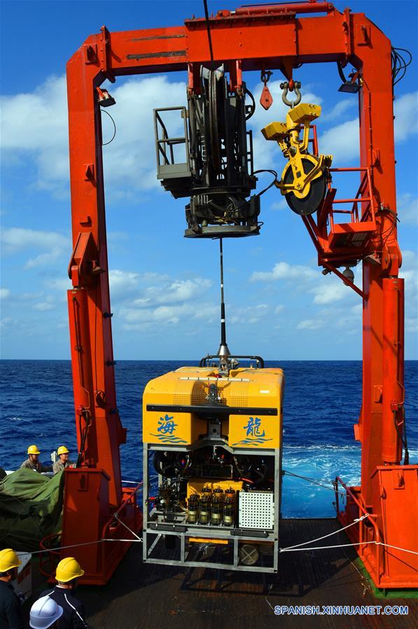 El sumergible no tripulado "Hailong III" es colgado para ser depositado en el mar para una prueba desde el barco de investigación chino Dayang Yihao (Océano número uno), el 24 de marzo de 2018. El sumergible completó el domingo una prueba marítima de 400 metros de profundidad en el océano Pacífico Occidental. El barco de investigación chino Dayang Yihao salió de Qingdao, provincia de Shandong, el 20 de marzo, llevando a 119 científicos a bordo para una expedición oceánica de 45 días. (Xinhua/Chen Hao)