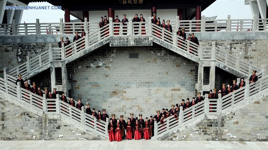 ANHUI, marzo 26, 2018 (Xinhua) -- Imagen del 25 de marzo de 2018 de parejas posando después de una boda colectiva al estilo del grupo étnico Han en un parque en Hefei, capital de la provincia de Anhui, en el este de China. Un total de 37 parejas asistieron el domingo a la boda. (Xinhua/Zhang Duan)