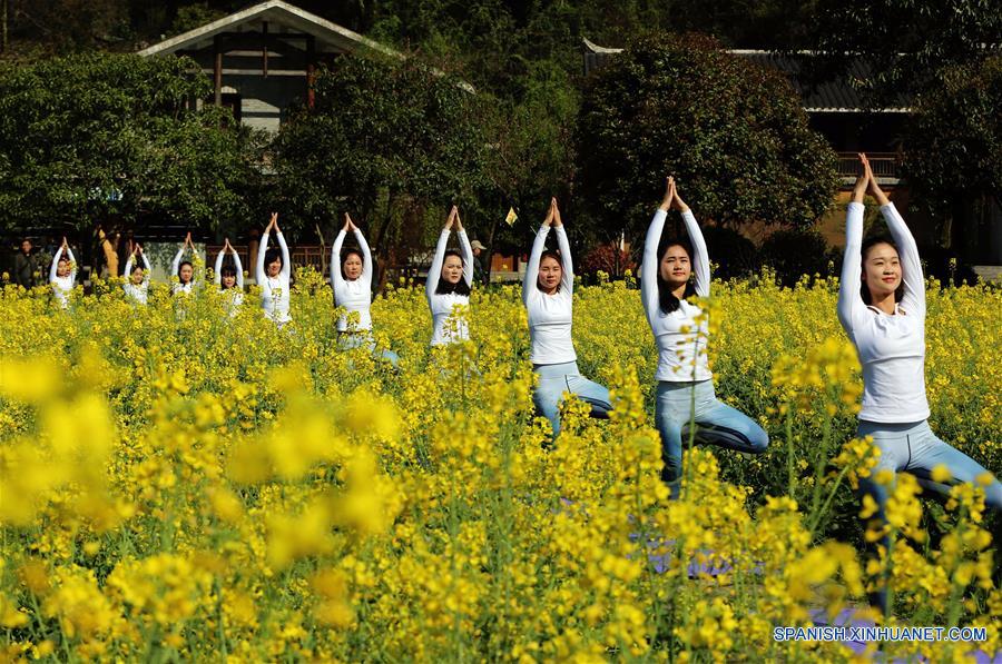 HUNAN, marzo 26, 2018 (Xinhua) -- Amantes del yoga practican en el punto escénico de la Cueva del Dragón Amarillo en Zhangjiajie, en la provincia de Hunan, en el centro de China, el 26 de marzo de 2018. (Xinhua/Wu Yongbing)