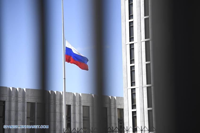 Vista de la bandera nacional de Rusia ondeando en la embajada de Rusia en Washington D.C., capital de Estados Unidos, el 26 de marzo de 2018. Washington anunció la expulsión de 60 diplomáticos rusos, 48 de Washington y 12 de la misión rusa en la ONU, así como el cierre del consulado general de Rusia en Seattle. Estados Unidos afirmó que esta es una muestra de solidaridad con su aliado Reino Unido, país que responsabilizó a Moscú del envenenamiento de un ex espía ruso el 4 de marzo con un agente nervioso de clase militar. Rusia ha negado su participación en el ataque. (Xinhua/Yang Chenglin)