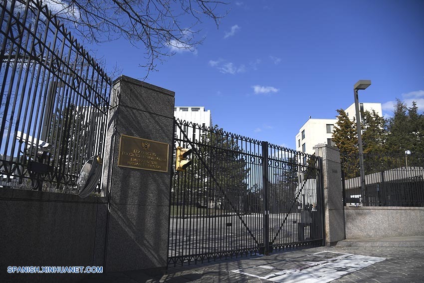 Vista de la fachada de la embajada de Rusia en Washington D.C., capital de Estados Unidos, el 26 de marzo de 2018. Washington anunció la expulsión de 60 diplomáticos rusos, 48 de Washington y 12 de la misión rusa en la Organización de las Naciones Unidas (ONU), así como el cierre del consulado general de Rusia en Seattle. Estados Unidos afirmó que esta es una muestra de solidaridad con su aliado Reino Unido, país que responsabilizó a Moscú del envenenamiento de un ex espía ruso el 4 de marzo con un agente nervioso de clase militar. Rusia ha negado su participación en el ataque. (Xinhua/Yang Chenglin)