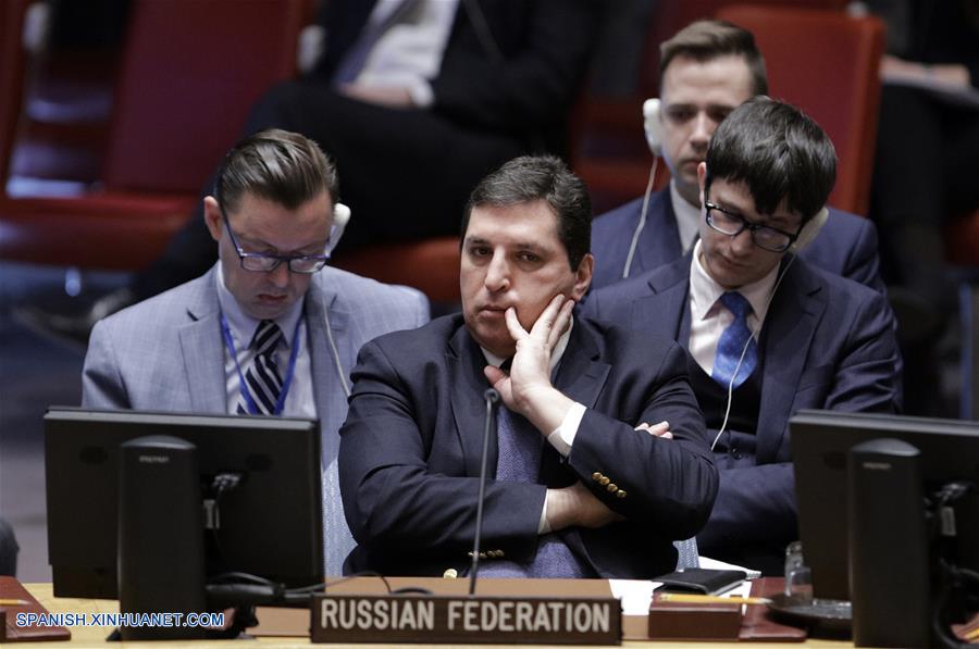NUEVA YORK, marzo 26, 2018 (Xinhua) -- El representante permanente adjunto de Rusia ante la Organización de las Naciones Unidas (ONU), Vladimir Safronkov (frente), asiste a una reunión del Consejo de Seguridad de la ONU sobre la situación en Medio Oriente, en la sede de la ONU en Nueva York, Estados Unidos, el 26 de marzo de 2018. La Secretaría de la ONU recibió la decisión de Estados Unidos de expulsar a 12 diplomáticos de la misión rusa en la organización mundial, anunció el lunes un vocero. (Xinhua/Li Muzi)