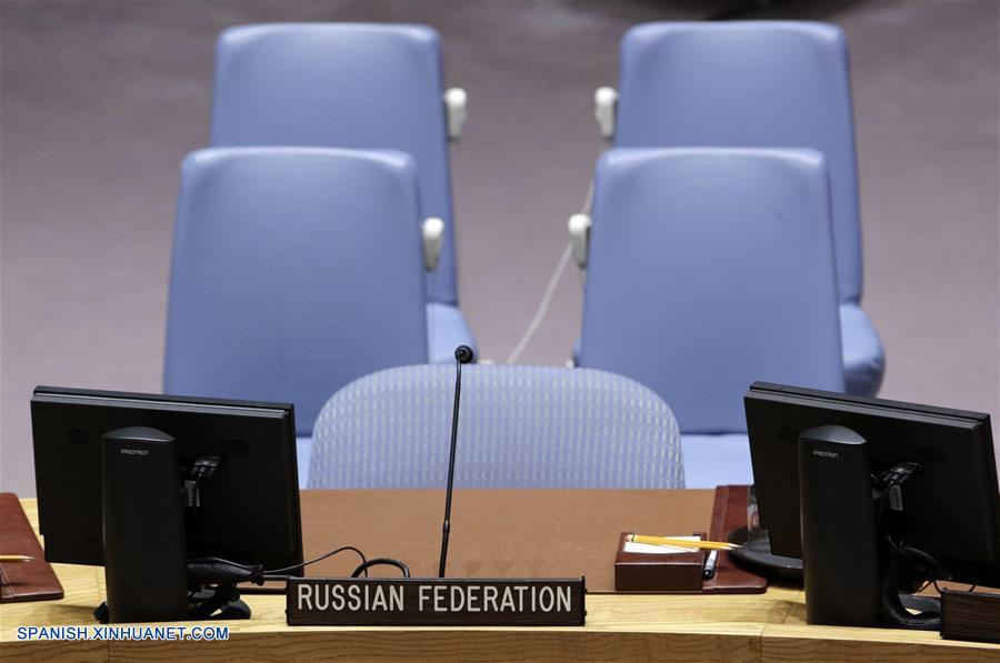 NUEVA YORK, marzo 26, 2018 (Xinhua) -- Vista de lugares vacíos correspondientes a la delegación de Rusia en la cámara del Consejo de Seguridad de la Organización de las Naciones Unidas (ONU) después de una reunión del Consejo de Seguridad de la ONU con respecto a la situación en Medio Oriente, en la sede de la ONU en Nueva York, Estados Unidos, el 26 de marzo de 2018. La Secretaría de la ONU recibió la decisión de Estados Unidos de expulsar a 12 diplomáticos de la misión rusa en la organización mundial, anunció el lunes un vocero. (Xinhua/Li Muzi)