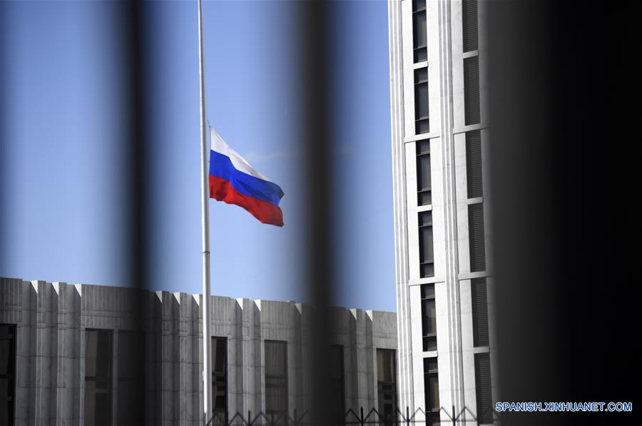Vista de la bandera nacional de Rusia ondeando en la embajada de Rusia en Washington D.C., capital de Estados Unidos, el 26 de marzo de 2018. Washington anunció la expulsión de 60 diplomáticos rusos, 48 de Washington y 12 de la misión rusa en la ONU, así como el cierre del consulado general de Rusia en Seattle. Estados Unidos afirmó que esta es una muestra de solidaridad con su aliado Reino Unido, país que responsabilizó a Moscú del envenenamiento de un ex espía ruso el 4 de marzo con un agente nervioso de clase militar. Rusia ha negado su participación en el ataque. (Xinhua/Yang Chenglin)