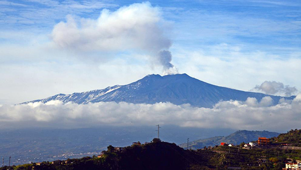 El volcán Etna lanzando humo en diciembre de 2015, visto desde la ciudad de Taormina (Giovanni Isolino / AFP)