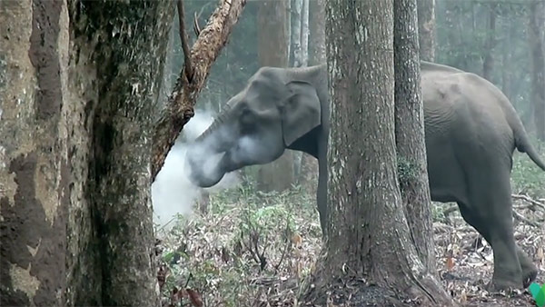 En el vídeo, captada por Vinay Kumar, director asociado de la Sociedad de Conservación de la Vida Silvestre (WCS, por sus siglas en inglés), se puede observar al paquidermo recogiendo algo del suelo con su trompa, llevándoselo a la boca y luego expulsando una enorme cantidad de humo.