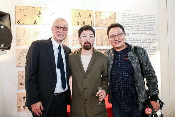 Zhang Weijun, izquierda, hijo de Zhang Leping, junto con el ilustrador chino Xiong Liang, centro, y Wang Lijun, secretario general del Comité de Artes de Dibujos Animados de la Asociación de Artistas de China, asisten a la ceremonia de entrega de premios en el Centro de Convenciones y Exposiciones de Bolonia en Italia, el 26 de marzo de 2018. [Foto proporcionada a chinadaily.com.cn]