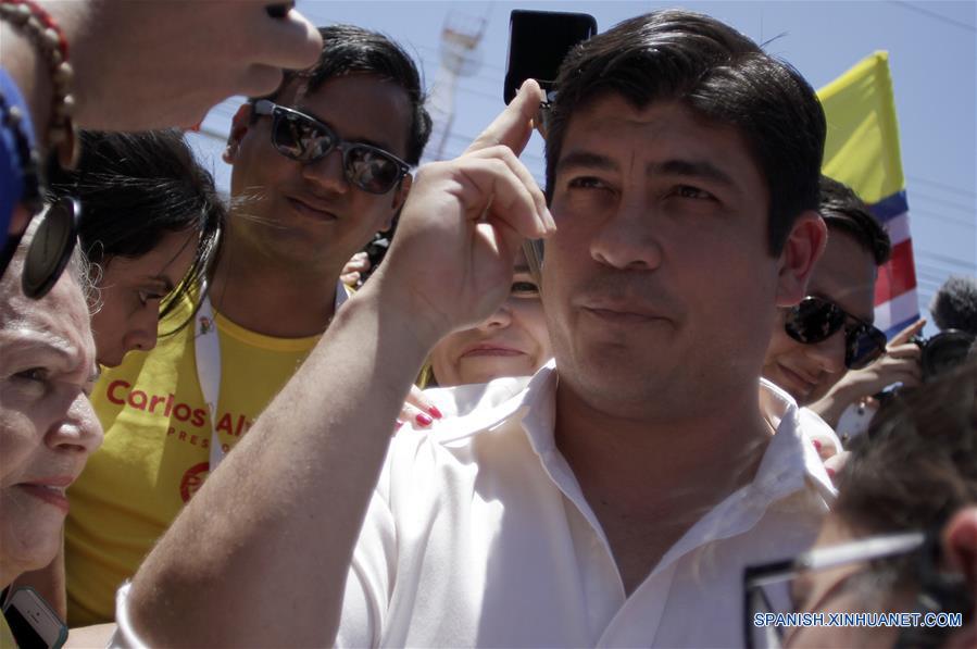 SAN JOSE, abril 1, 2018 (Xinhua) -- El candidato presidencial por el Partido Acción Ciudadana (PAC) de Costa Rica, Carlos Alvarado (c), saluda a sus simpatizantes despues de emitir su voto, en San José, Costa Rica, el 1 de abril de 2018. Unos 3,3 millones de costarricenses están habilitados para elegir desde las 6:00 hora local (12:00 GMT) a su número 44 presidente de la historia, que se definirá entre el conservador evangélico del Partido Restauración Nacional, Fabricio Alvarado, y el oficialista de Acción Ciudadana (PAC), Carlos Alvarado. En total, 6.542 juntas receptoras de votos estarán abiertas por 12 horas de forma ininterrumpida, tiempo límite para que se decidan los comicios en esta segunda ronda, marcados por una incertidumbre diagnosticada en la última encuesta del Centro de Investigación y Estudios Políticos de la Universidad de Costa Rica (CIEP-UCR) cuyo hallazgo fue de empate técnico. (Xinhua/Kent Gilbert)