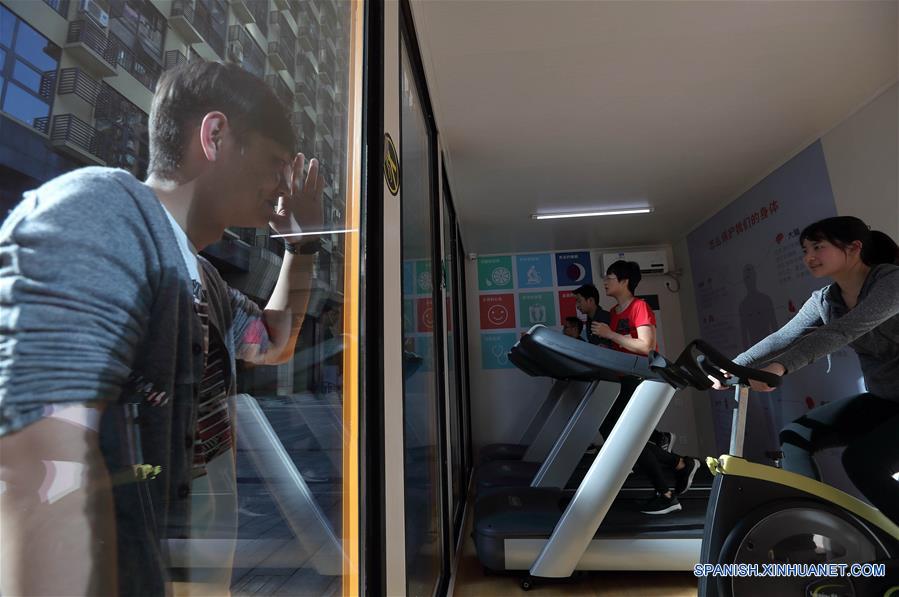 Un hombre observa el interior de un gimnasio compartido de Chengdu, en la provincia de Sichuan, en el suroeste de China, el 2 de abril de 2018. El gimnasio compartido de 24 horas en Chengdu está equipado con un purificador de aire, aire acondicionado y un dispensador de agua. Personas pueden ejercitarse en el gimnasio compartido al escanear su código QR. (Xinhua/Jiang Hongjing)