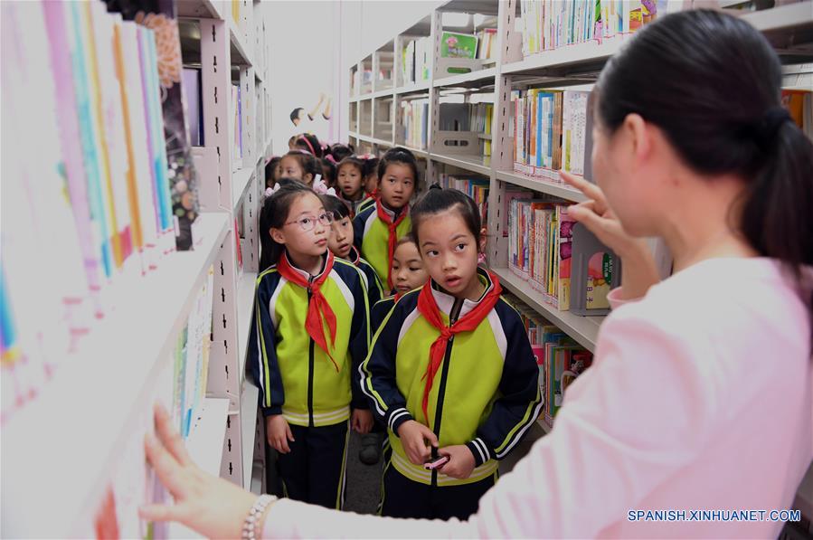 Ni?as visitan una librería en el marco del Día Internacional del Libro Infantil, en la Escuela Primaria Camino de Yulan, en la ciudad de Nanning, capital de la Región Autónoma Zhuang de Guangxi, en el sur de China, el 2 de abril de 2018. (Xinhua/Zhou Hua)