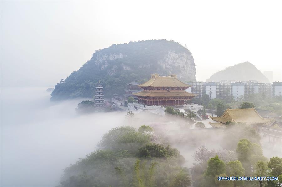Imagen aérea de niebla de advección permaneciendo sobre el Río Liujiang en Liuzhou, en la Región Autónoma Zhuang de Guangxi, en el sur de China, el 2 de abril de 2018. (Xinhua/Li Bin)